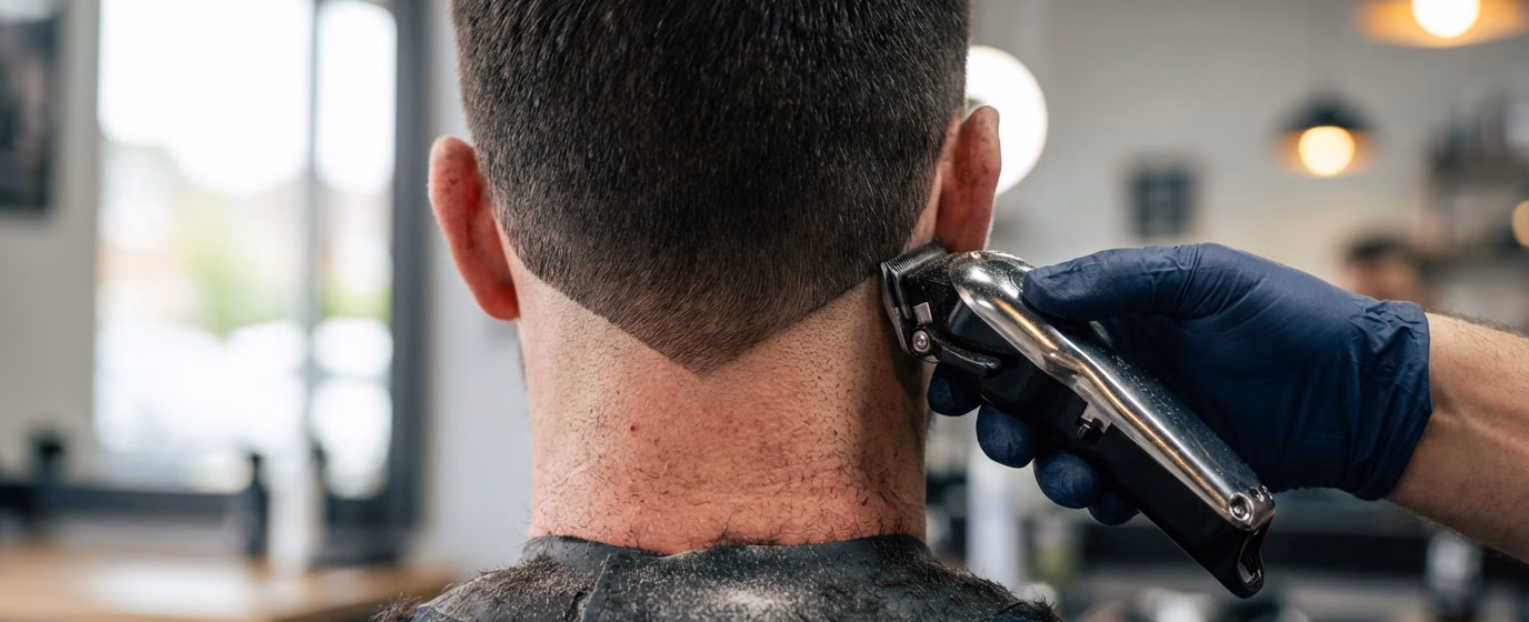 Un dégradé en V est une technique de coupe qui consiste à tracer une ligne géométrique en forme de V à l’arrière de la tête, au niveau de la nuque. Contrairement à une nuque droite ou arrondie, cette forme crée un point central vers le bas, qui affine visuellement la silhouette. C’est précisément cet angle qui définit l’identité graphique de la cuenta. Le barbier utilise une tondeuse de précision pour obtenir des lignes nettes et symétriques.
