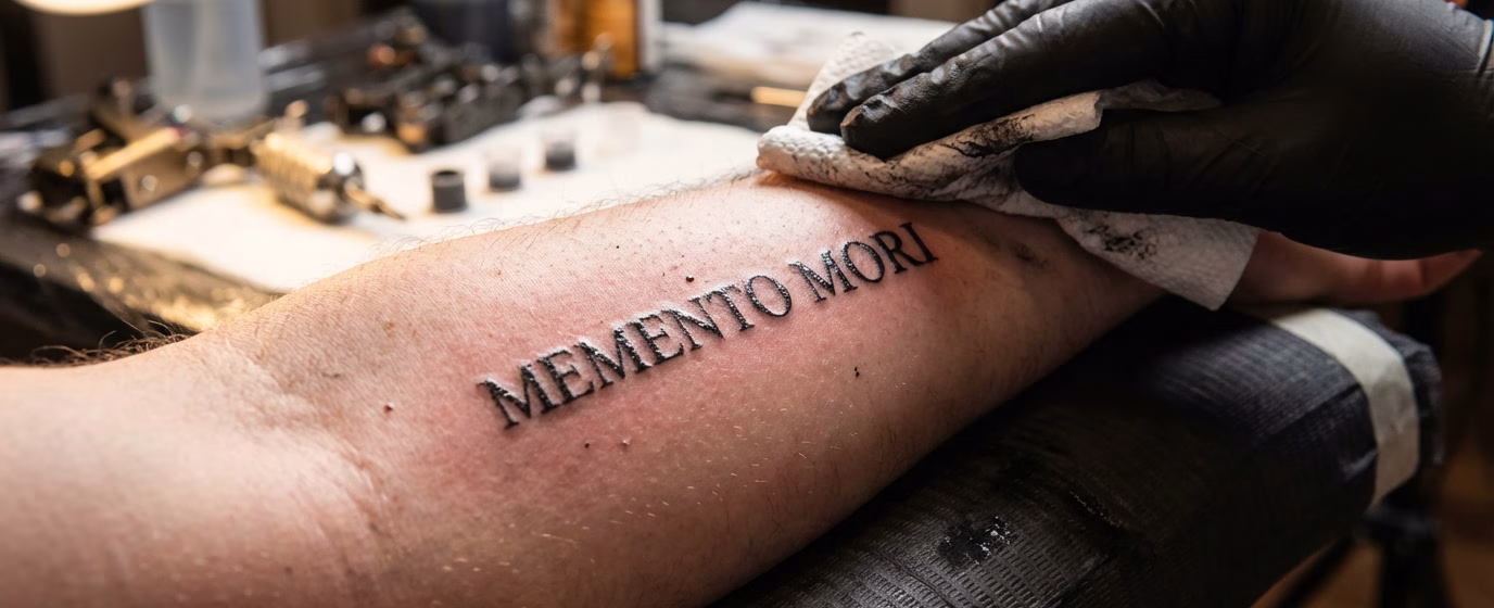 Memento mori et Carpe diem se disputent la première place mondiale des phrases latines les plus tatouées. Memento mori — littéralement « souviens-toi que tu vas mourir » — séduit par son pouvoir de rappel : la vie est courte, chaque jour compte. Cette expression, utilisée depuis l’Antiquité romaine, a connu un regain d’intérêt ces dernières années dans la culture tatouage contemporaine.